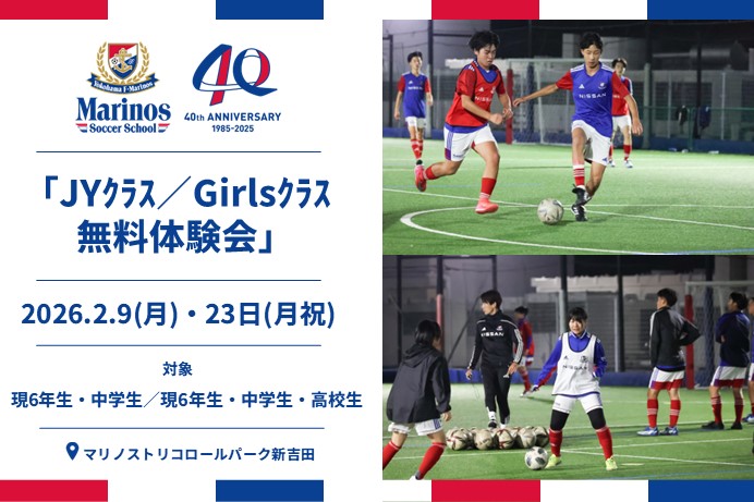 マリノスサッカースクール新吉田校では、現小学6年生を対象とした「JYクラス」、現小学6年生及び中学生(1~3年生)、高校生(1~3年生)の女子選手を対象とした「Girlsクラス」の無料体験会を実施いたします。