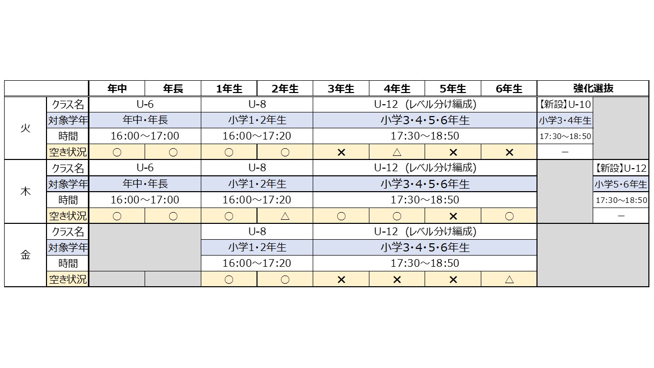 ※人数に応じて2クラスに編成してトレーニングを行う場合がございます。 - U‐12クラス(レベル分け編成)