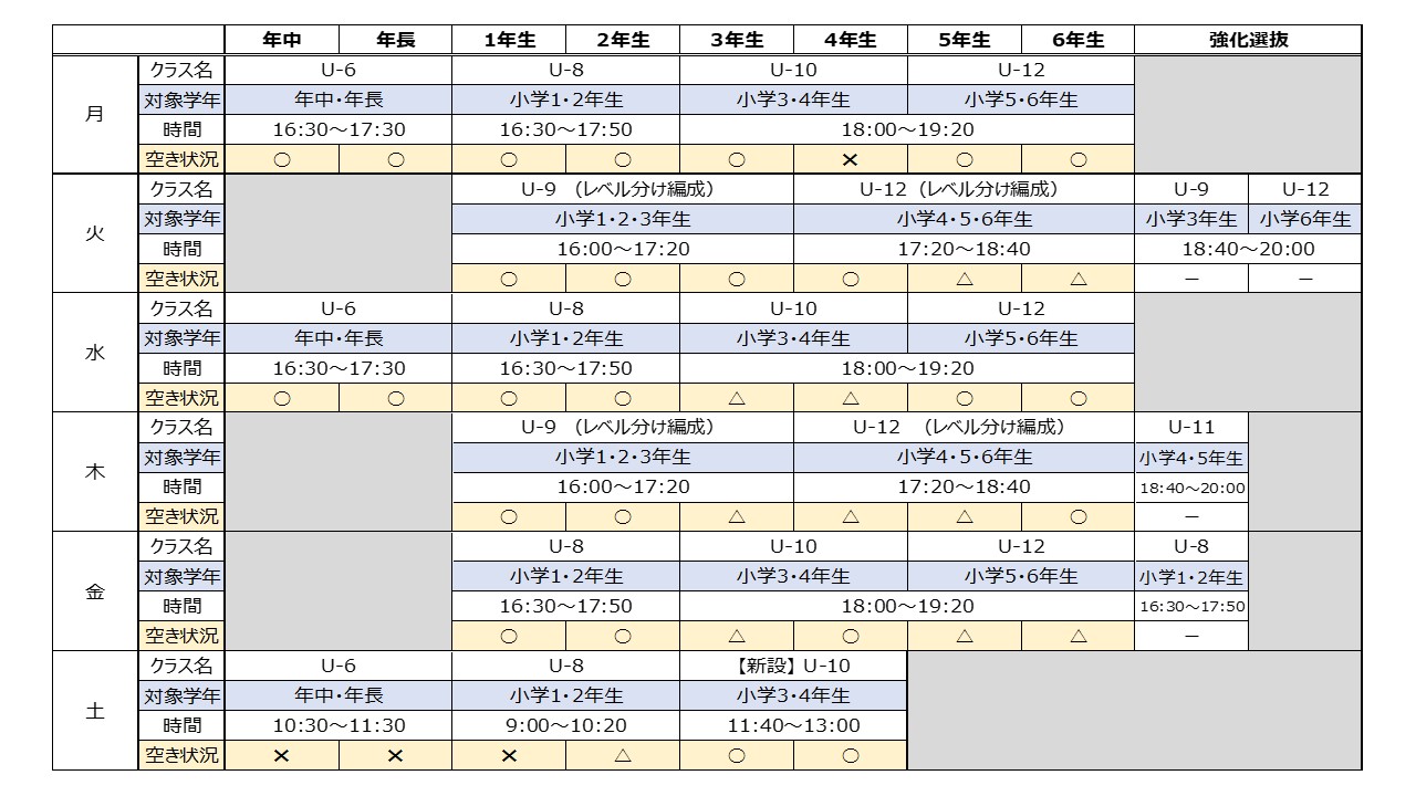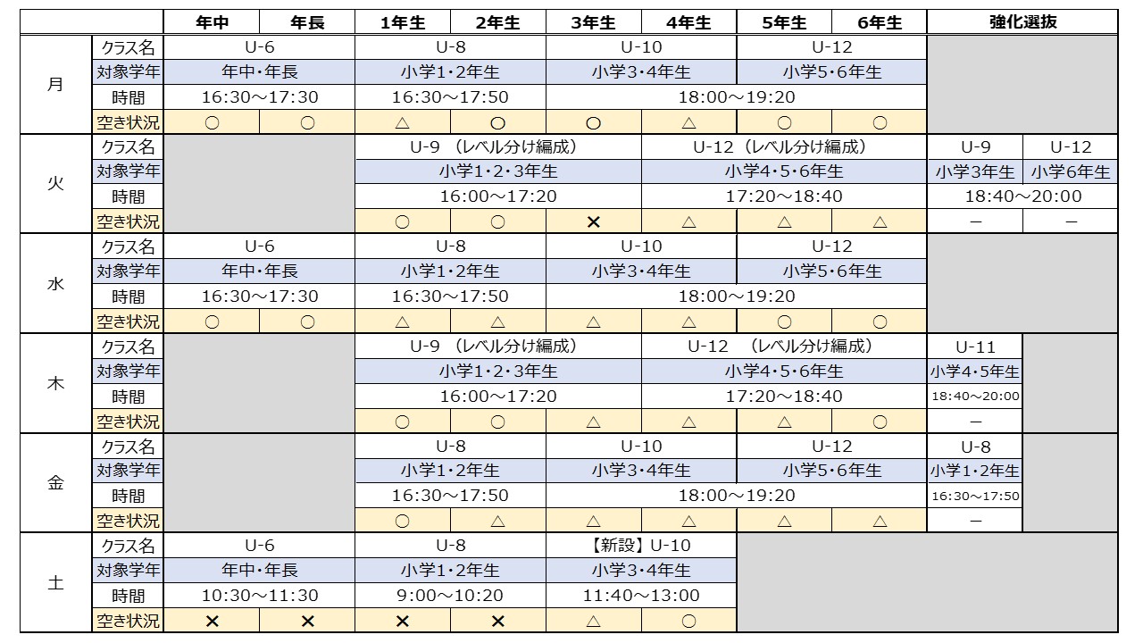 ※人数に応じて2クラスに編成してトレーニングを行う場合がございます。 - U-9・U‐12クラス(レベル分け編成)