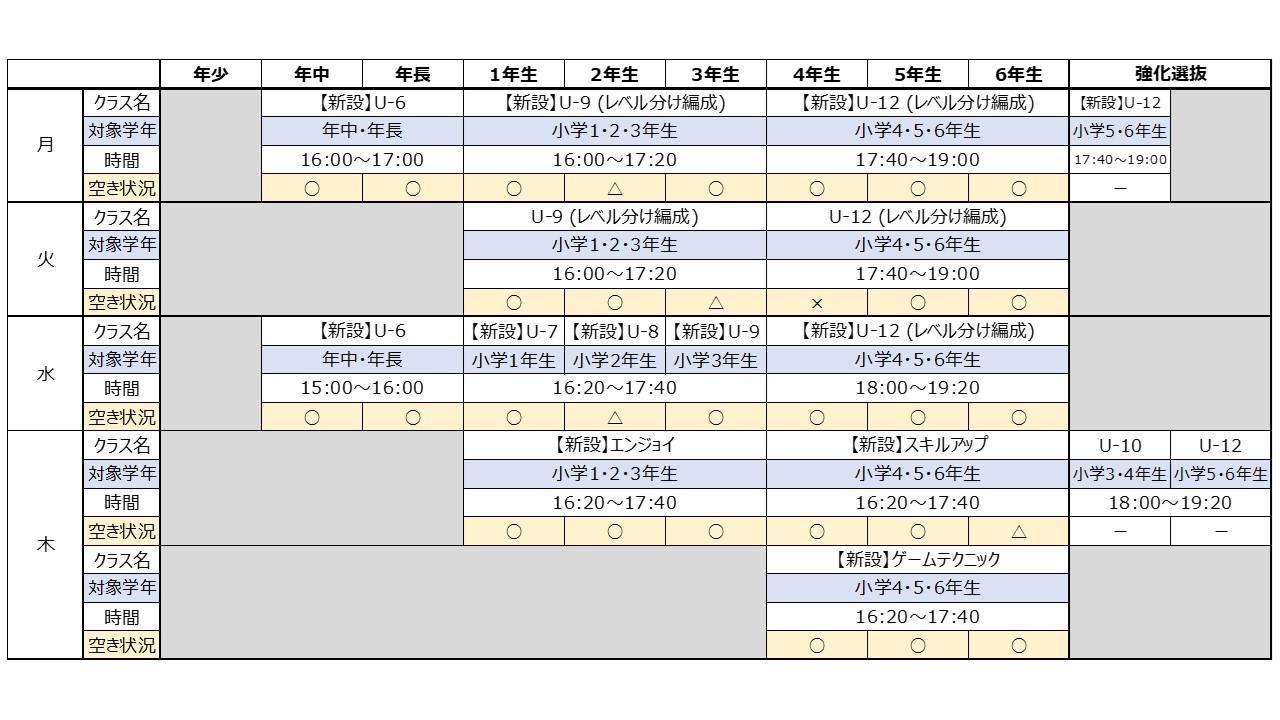 ※人数に応じて2クラスに編成してトレーニングを行う場合がございます。 - U-9・U‐12クラス(レベル分け編成)