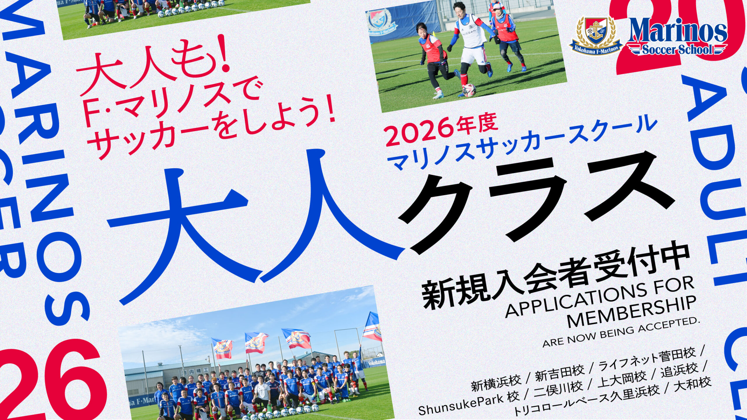 マリノスサッカースクールでは、2026年度4月からの<大人クラス>新規スクール生の募集を開始いたします。2018年より開校し、現在約260名の会員が在籍をしています。
